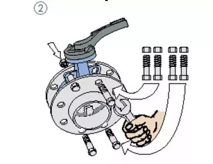 1、如所示,將閥門放置于預安裝的兩片法蘭之間,注意螺栓孔要整齊對齊。